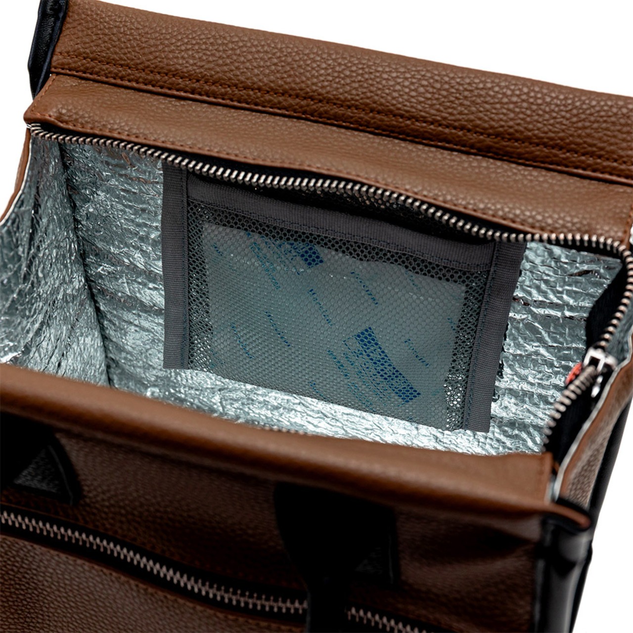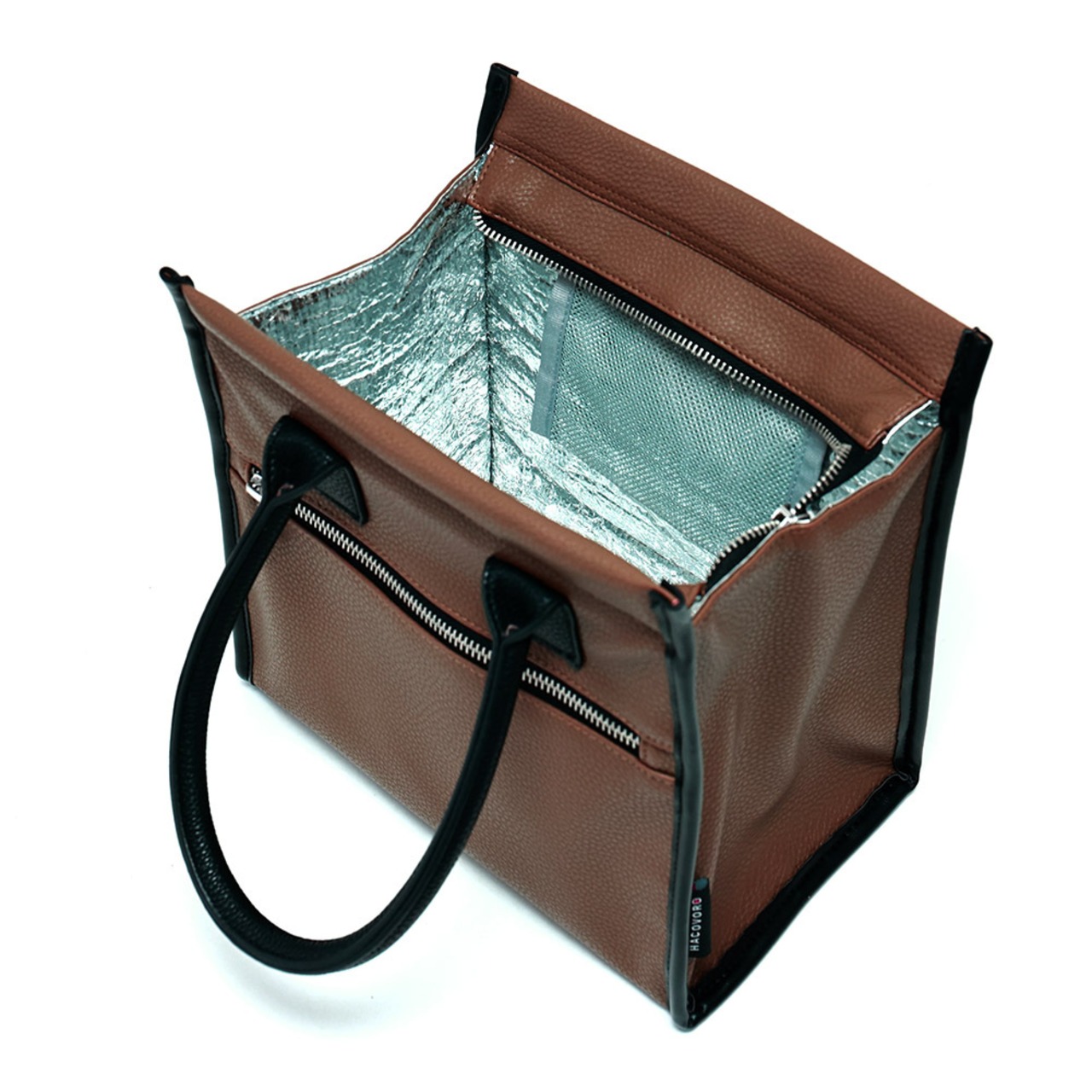 内側はアルミ蒸着仕様で、保温・保冷効果があります。コンビニで温めてもらったお弁当やスープは、温かさを保ったままで持ち運べます。また保冷剤の入るメッシュポケット付きなので、夏場も安心です。外側のファスナーポケットには、小袋の調味料やふりかけを入れたり、財布やスマホ等を入れることもできます。
